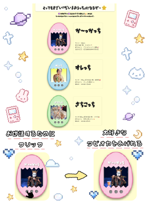 3枚の画像を使用して、派手にするという課題でした。かわいいとはかけ離れてる人をあえて可愛くかつ 流行りのたまごっち風に作成しました。 ボタンを押すと、各々絵文字が出るようにしギミックを付けました。