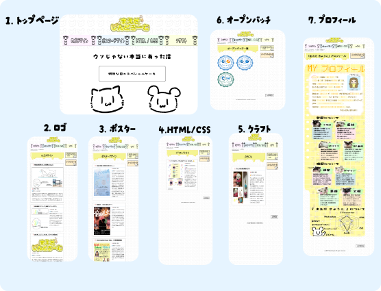 ポートフォリオを作成しました。文字を入れる枠や欄はできるだけillustratorで作成し 誰とも被らない唯一無二のものを作りました。背景のハムもオリジナルキャラクターにし 可愛さを上げました。上のメニューバーも背景が薄いので目に留まるようにカラフルにしました。 複雑なコードは特に使わずシンプルに仕上げました。基本のレイアウトは変えずにすることで どこに移動しても迷うことのないサイトにしました。