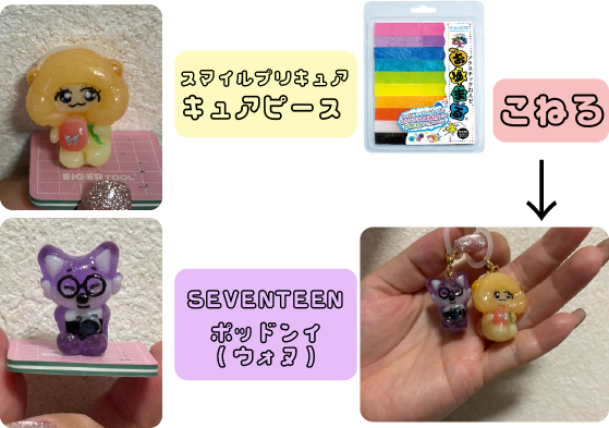 プレゼント用で作成しました。おゆまるはお湯で溶かして、冷えると固まる、 特殊なプラスチック製品です。100均にも販売してます。プリキュアは白と黄色を混ぜて作成しました。 目の部分は別でレジンで作成し、くっつけました。大変だったのはまつ毛の箇所です。プレゼントも喜んでもらえたので 本当によかったです。セブンティーンの方は透け感を大事にしたかったので透明と紫を混ぜて作成しました。 眼鏡のパーツは売ってないのでおゆまるで型を作って、レジンを入れて固めて作成しました。こちらも喜んで もらえたので頑張ってよかったです。