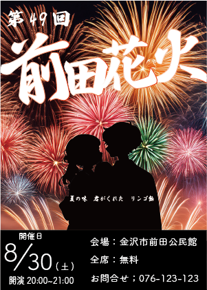 前田花火の文字に線で赤オレンジ黄色でグラデーションをかけました。 あくまでも花火の光景の邪魔はしたくないので、邪魔にならない暖色にしました。 シルエットで男女の青春感を出して、青春を感じさせる575をいれて ただのシルエットでしないようにしました。 下の概要欄は大きく表示して老若男女見やすくしました。