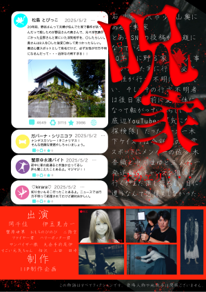 映画館に行った際に少し待っている間に「立ち止まって読みたいポスター」をコンセプトにしました。 細かい設定はなかったのでSNSで広まった話にし、SNSの投稿画面を並べて若い子も普段から使用しているツールなので読みたくなると思います。 呪家のフォントもホラー感のあるフォントにシャドウをつけて怖い演出をしました。 出演者も赤背景に白文字でホラー感も残しつつ分かりやすくしました。 背景には、文字を読んでいると後ろにゾッとくるような画像を配置しました。