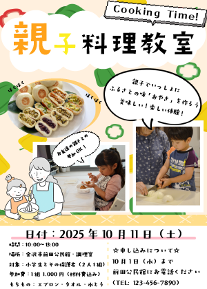 親子で参加する料理教室ポスターを作成しました。子供の写真を使って 楽しく参加している様子をイメージしました。 申し込みするのは親なので大人で下の概要で必要事項はシンプルにし 全部まとめました。日付に部分は線でマーカーを引いて目が引くようにしました。