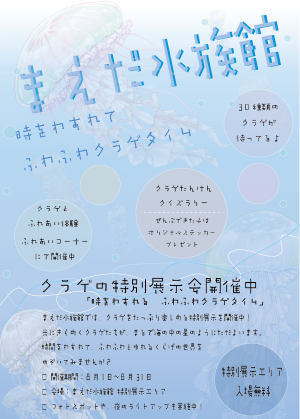 まえだ水族館の文字は影をつけて寒色ではあるけど、埋もれないようにしました。 カラフルな泡で注目してもらいたい内容をかいて子供たちに気をひかせて 同行した大人が見ても安心感のあるデザインにしました。遊び心でフォントは少し変わったのを使用しました。 下の概要は特に大事な場所や期間を◻︎を入れて分かりやすくしました。 背景に使用しらたクラゲは2種類しか素材がなかった為、Photoshopでカラーバランスを変更し、2種類しか素材がなくても同じのを使っていないように見えるように意識しました