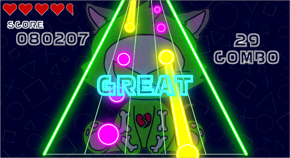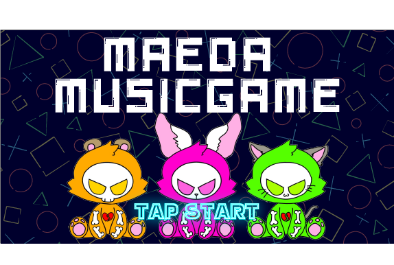 ミュージックゲーム画面風を作成しました。上の画像は始まる画面にし、背景は〇△✕▢で 作成し、ネオン風にしたかったので破線で途切れさせネオン管を表現しました。 キャラクターは参考画像を元に出来るだけ変更しオリジナルになるようにAlbispaintで作成しました。 下のゲーム画面はで線を効果でスタイライズでネオンぽくし音ゲー感があるように仕上げました。 上の画像でも使用したキャラクターを背景に持ってきてそのキャラクターと遊んでいるようにしました。
