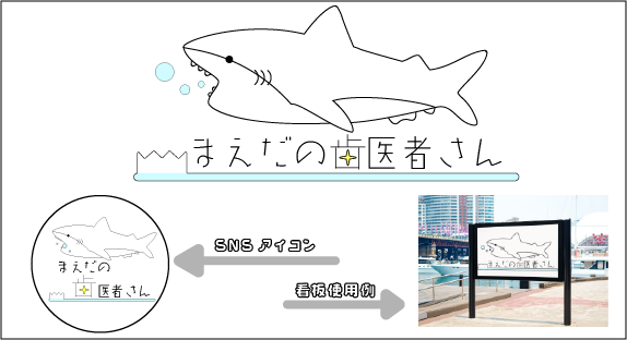 サメは歯がたくさんありすぐ生え替わります。他の歯科のロゴを見ていても、 あまりサメを使用したのがあまりなく、作成しました。 清潔感を出すためにシンプルにしました。口を開けて泡を出しうがいをしているようにし、 下には歯ブラシを作成しぱっと見で歯医者と分かるようにしました。 フォントは個性的なのを使用し、古臭い印象を無くしました。 「歯」という文字がフォントになかったので、作成し文字の中にキラッと輝かせました
