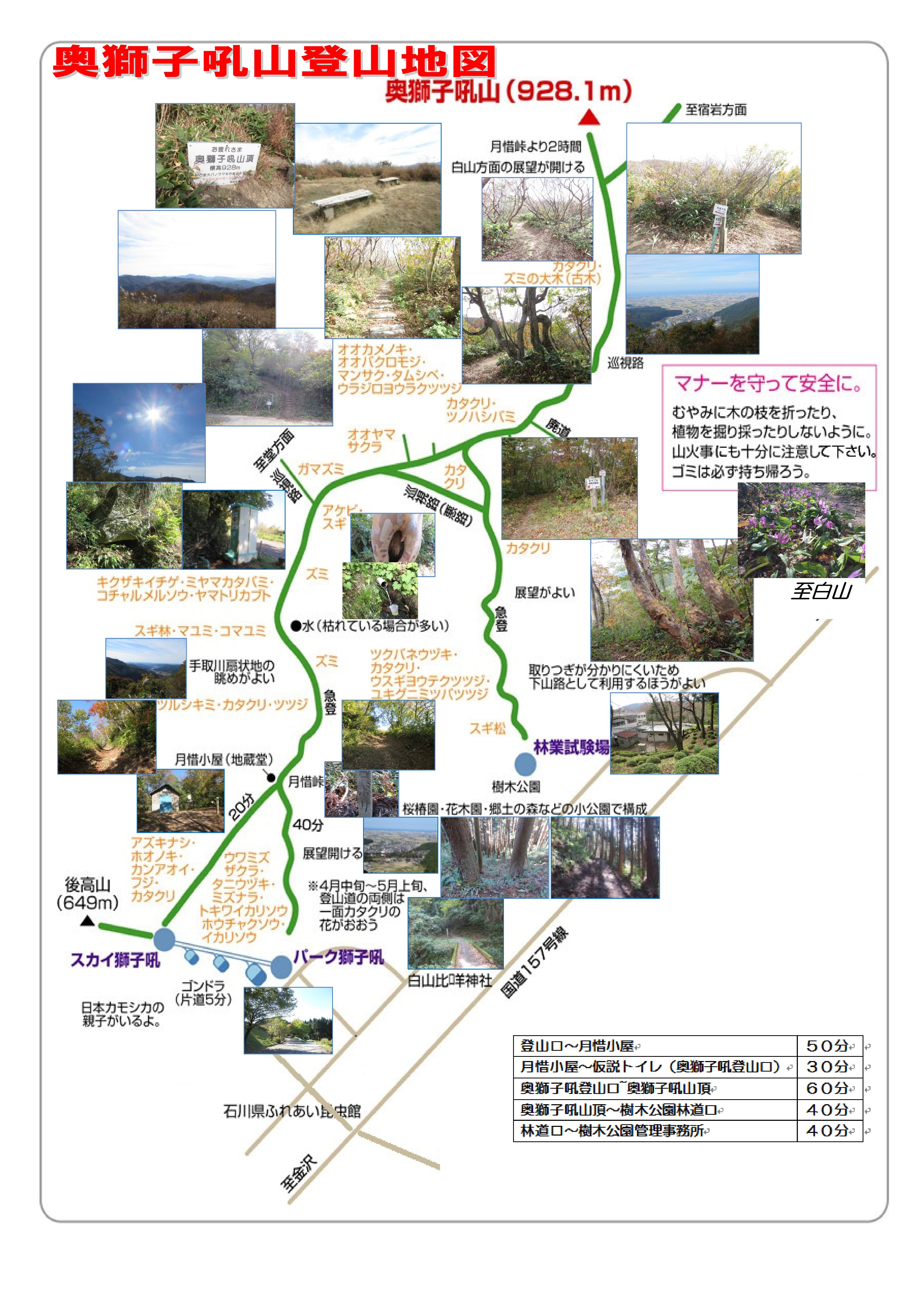 本来の獅子吼は奥獅子吼山あたりを指しており、奥獅子吼の頂に登れば、スカイ獅子吼からは眺めることのできない白山方面の眺望も開け、四季を通じて楽しめるトレッキングコースとなっています。